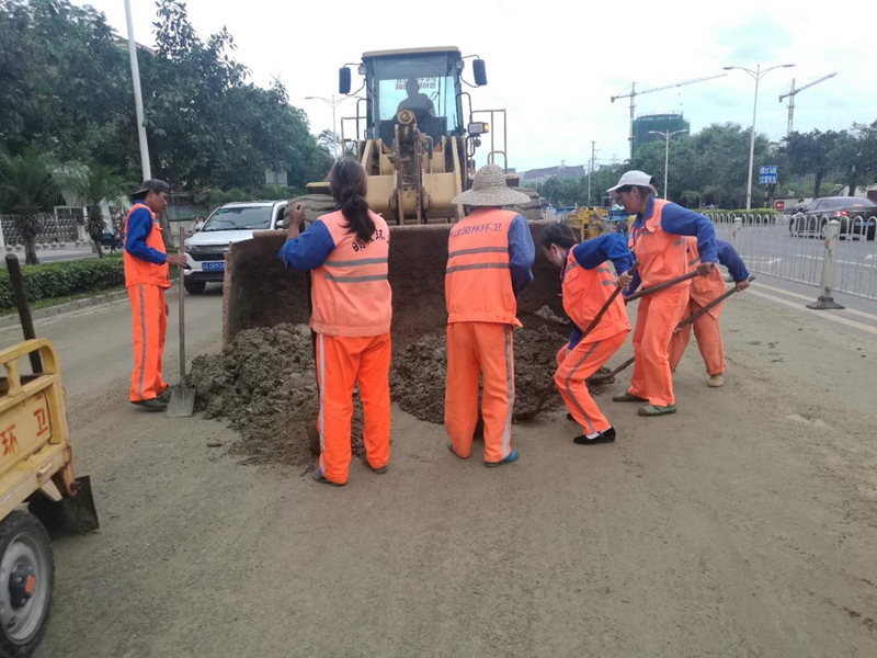 7月23日上午,集團公司組織人員,并派出鏟車、清地車、高壓沖洗車等加強作業(yè),對臺風過后的主次干道堆積泥沙進行大沖洗,對散落垃圾、斷裂樹枝樹葉進行全面普掃清運,對倒伏樹木及時扶正,加強垃圾清運,確保道路暢通整潔。截止發(fā)稿,集團公司共出動機械化清掃車輛28車次,各類垃圾壓縮車輛271車次,清運垃圾851噸。