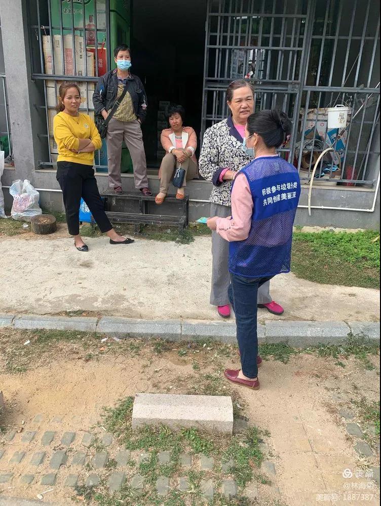 吉陽(yáng)環(huán)衛(wèi)垃圾分類(lèi)督導(dǎo)員與社區(qū)工作人員對(duì)居民分發(fā)垃圾分類(lèi)手冊(cè)