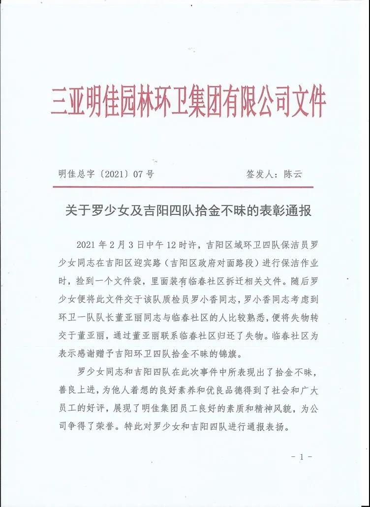 會上,明佳集團(tuán)黨支部書記、董事長陳明宣讀了《關(guān)于羅少女及吉陽四隊(duì)拾金不昧的表彰通報》