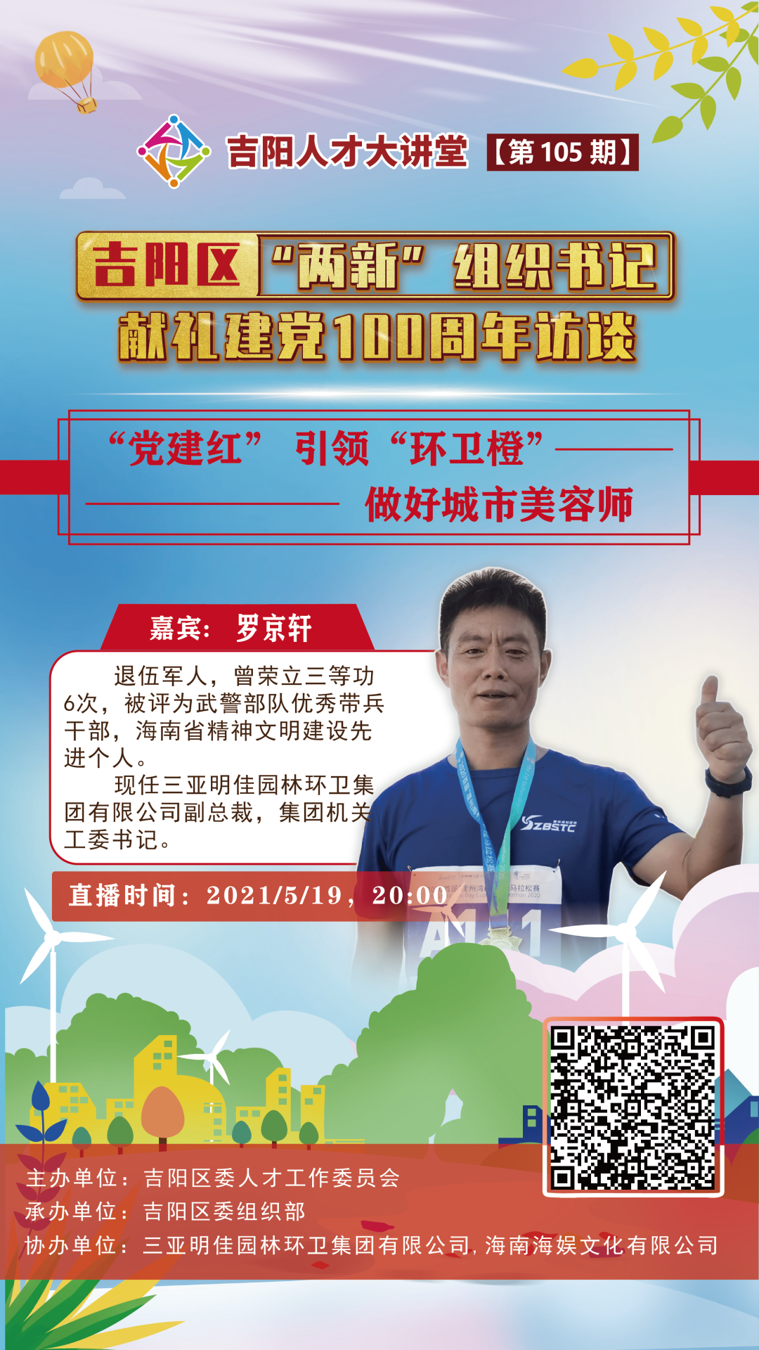 近日,第105期吉陽(yáng)人才大講堂邀請(qǐng)到三亞明佳園林環(huán)衛(wèi)集團(tuán)有限公司副總裁、集團(tuán)機(jī)關(guān)工委書記羅京軒分享以“黨建紅”引領(lǐng)“環(huán)衛(wèi)橙”,助力城市清潔的好經(jīng)驗(yàn)、好做法,直播吸引近25.48萬(wàn)人次在線觀看,其中不少網(wǎng)友為來自全國(guó)各地的環(huán)衛(wèi)工人。